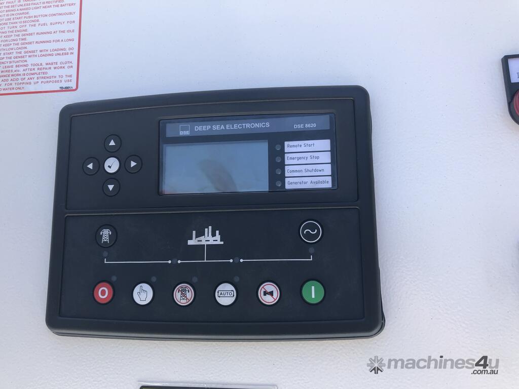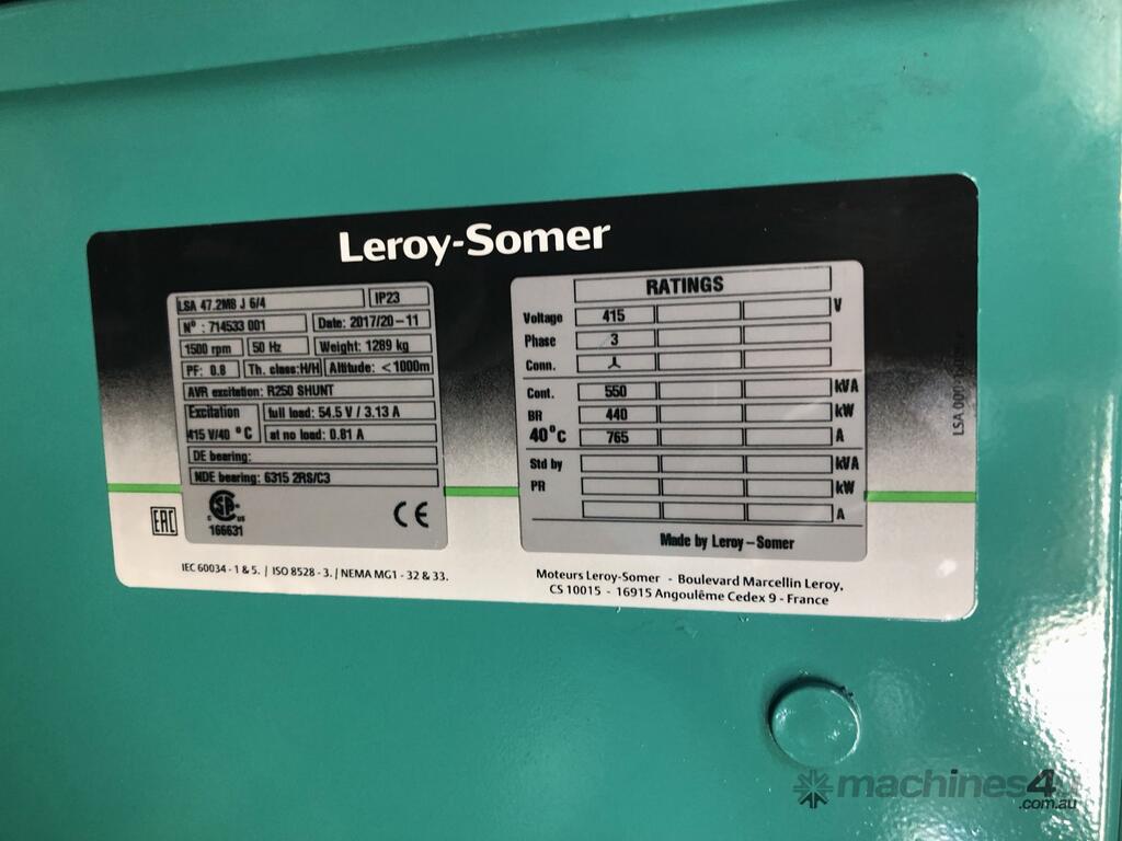 525kVA Doosan powered silenced generator set ( 580kVA stand by rated), Leroy Some alternator, DSE8620 capable of sync to mains. ABB motor breaker. 8 hrs run time base tank 100% load.