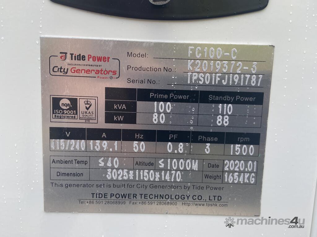 One Unit Tide Power diesel generator model HC100C, 50Hz, 240 415Vac, Cummins eng....